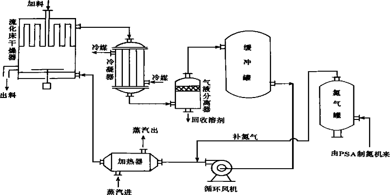 操作時(shí)物料通過(guò)加料器,定量加入帶攪拌的流化床干燥器中。在熱風(fēng)( 氮?dú)饣蚩諝? 作用下,干燥器內(nèi)物料產(chǎn)生穩(wěn)定的流態(tài)化,并在熱風(fēng)與濕物料接觸中進(jìn)行傳熱和傳質(zhì)。干燥過(guò)程中物料所含濕分不斷蒸發(fā)和分離,產(chǎn)品也隨之干燥至規(guī)定的含濕率。干燥操作中揚(yáng)起的細(xì)粉由干燥室上部袋濾器捕集,并通過(guò)自動(dòng)振打機(jī)構(gòu)定時(shí)迫使它脫離濾袋表面,重新回到干燥室料層。從濕物料中不斷蒸發(fā)的溶劑蒸氣隨氮?dú)鈳С龈稍锲?并在后面的冷凝器中被凝結(jié)成液體而加以回收。已去除液體溶劑的干燥介質(zhì)經(jīng)加熱后重新循環(huán)使用。當(dāng)閉路系統(tǒng)發(fā)生泄漏或其他原因引起壓力變動(dòng)時(shí),由氮?dú)夤拮詣?dòng)向閉路系統(tǒng)補(bǔ)充適量氮?dú)?。氮?dú)庀牧恳话銥?∽5m3/ h。