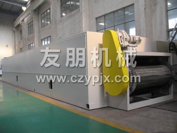 整個(gè)生產(chǎn)線為全封閉型(對(duì)物料而言),分別由擺動(dòng)布料段、干燥段、出料段三部分組成。擺動(dòng)布料段作用是使海藻均勻分散在網(wǎng)板上,并且勻速輸送到干燥段。海藻先后經(jīng)過80℃熱風(fēng)干燥段,90℃熱風(fēng)干燥段和120℃熱風(fēng)干燥段后,再經(jīng)過出料段排料。各單元內(nèi)的循環(huán)風(fēng)方向根據(jù)物料干燥階段不同和工藝要求需要,可采用向下式,向上式或兩者交替進(jìn)行。干燥加熱所需熱風(fēng)由引風(fēng)機(jī)吸入,并在風(fēng)機(jī)出風(fēng)口首先經(jīng)預(yù)分布器,再經(jīng)過孔板均風(fēng)后,熱風(fēng)從物料的下面向上(或從物料的上面向下)穿透物料層,對(duì)物料進(jìn)行加熱。
